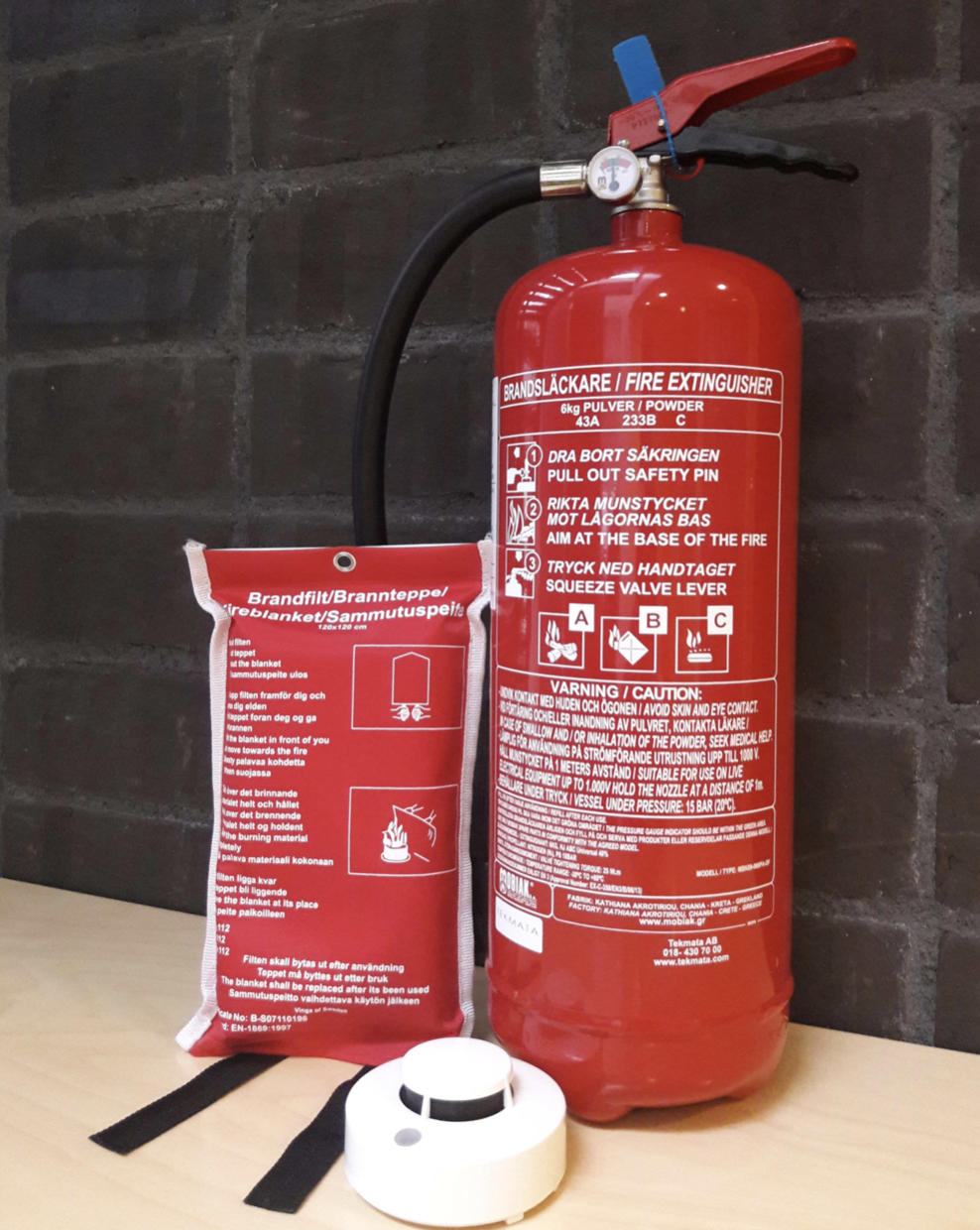 Med brandsläckare och brandfilt kan du snabbt släcka mindre bränder. Köp gärna dessa till lägenheten. 6 kg Pulversläckare rekommenderas.