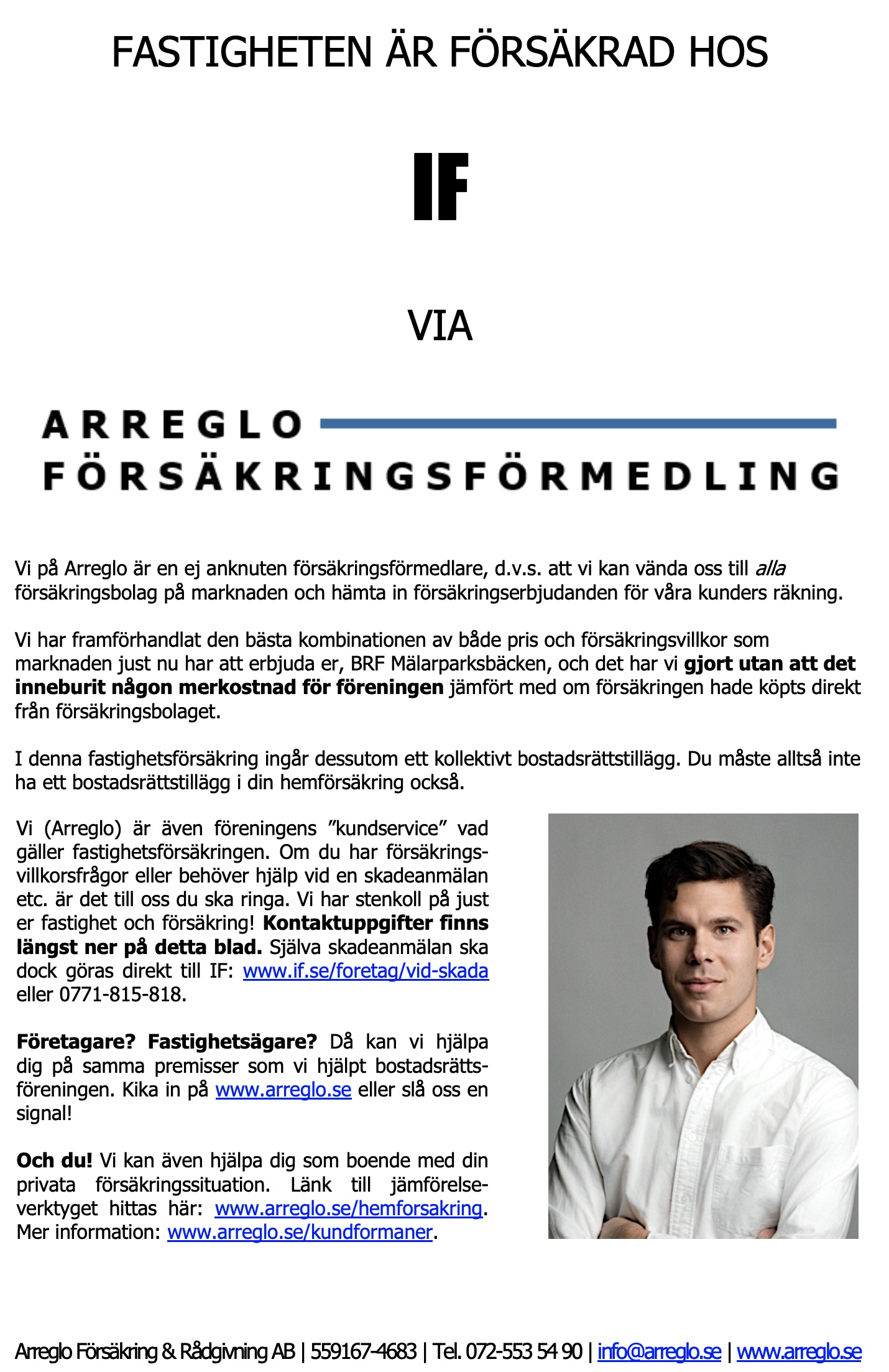 För att kunna hitta den försäkring som passar oss bäst, utifrån innehåll och pris, använder vi en försäkrinksmäkare. Företaget vi anlitar är Arreglo Försäkringar & Rådgivning AB.